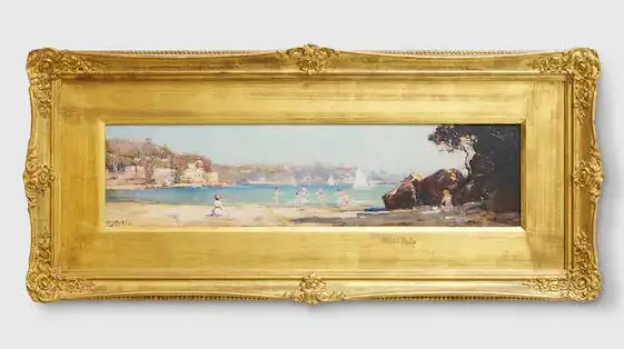 Lot 30 – Arthur Streeton, Mosmany Bay, c1907, oil, 16 x 65 cm, est. $300,000-$500,000. “Fair Dinkum” – “unquestionably good or genuine”