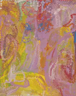 Lot 38 – Emily Kngwarreye, Merne Alhalkere, 1993. Synthetic polymer paint, 153 x 121.5 cm, est. $80,000-$100,000. Emily Engages
