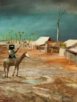 Lot 9 – Sidney Nolan, Early Morning Township, 1955. Ripolin and oil on board, 85.5 x 64 cm, est. $1,5 – $2 million. Stands and Delivers