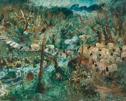 Lot 12 – John Perceval, Landscape with Sheep, 1958. Oil, 60 x 75.5 cm, est. $90,000-$120,000. Silly Sally Swiftly Shooed Seven Silly Sheep