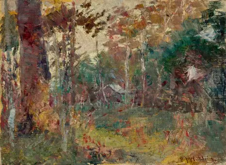 Lot 16 – Frederick McCubbin, Edge of the Clearing. Oil, 25.5 x 35 cm, est. $50,000-$70,000. Touting Trout Provenance