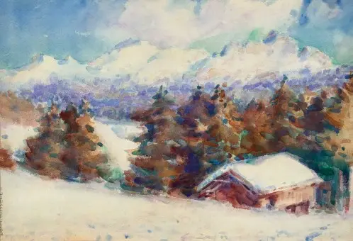 Lot 17 – John Peter Russell, Snow in the Alps (Switzerland), c.1912-15. Watercolour, 35 x 51 cm, est. $10,000-$15,000. Swiss Bliss