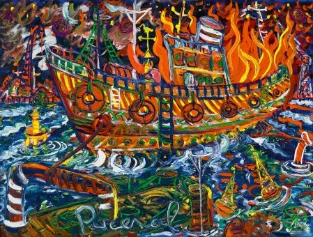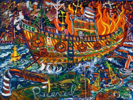 Lot 45 – John Perceval, The Burning of the Ark, c1994. Oil, 91.5 x 122 cm, est. $45,000-$65,000. Burn Off