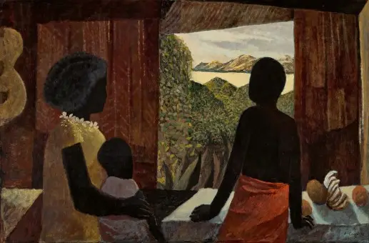 Lot 46 – Ray Crooke, Family Group, Thursday Island, 1962-63. Oil, 60.5 x 91.5 cm, est. $40,000-$60,000. Your Island in the Sun