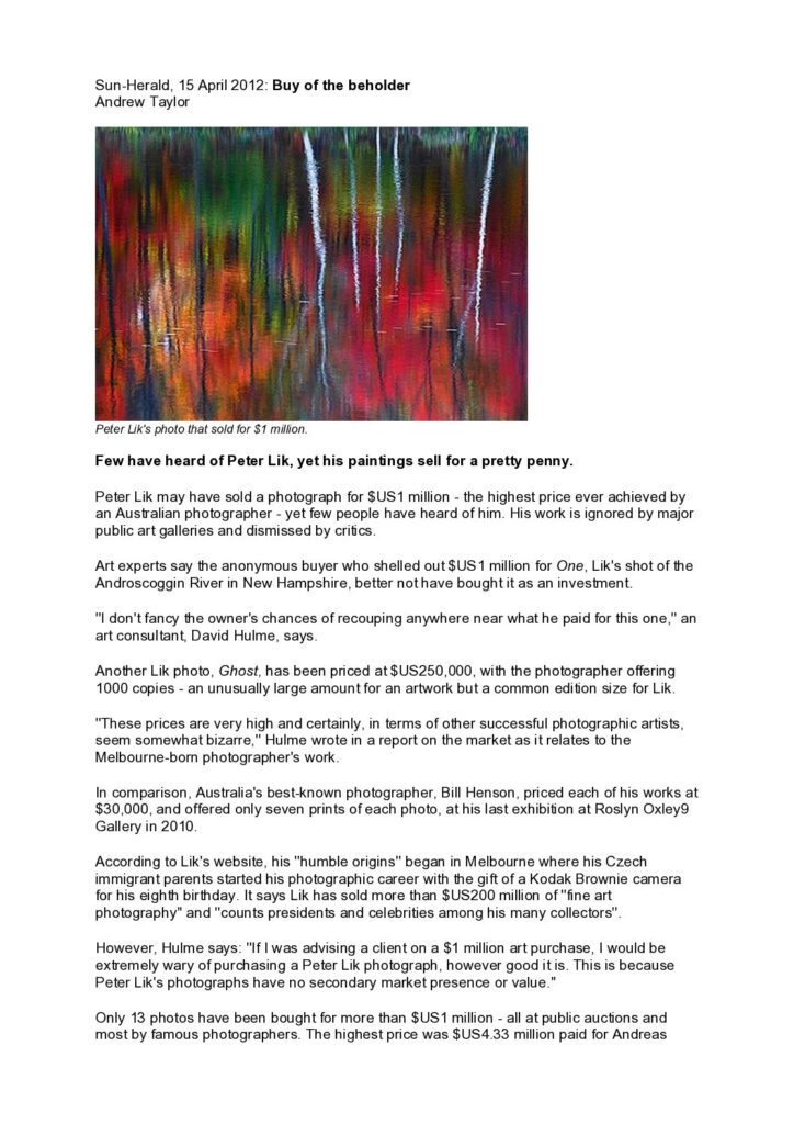 “Peter Lik may have sold a photograph for $US1 million – the highest price ever achieved by an Australian photographer – yet few people have heard of him. …