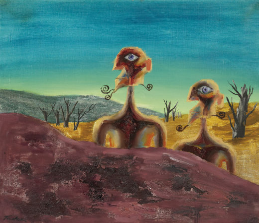 Lot 1, Rayner Hoff, Pacific Beach, est. $25,000-35,000. Move over Charles Meere and Max DupainLot 2, Lloyd Rees, Towards Balmain, 1932, est. $18,000-28,000. Pencil PerfectionLot 3, Justin O’Brien, Still Life against a Landscape, 1971, est. $70,000-90,000. Meditative – ContemplativeLot 4, Charles Blackman, Schoolgirl, 1954, est. $70,000-90,000. The girl in blue, last purchased in ’72 – could this be for you?Lot 15, Fred Williams, Trees and Hillsides 1964, $ 1 million – $1.2 million. No Gumtrees AllowedLot 18, Lin Onus, Guyi Bulgabula, 1992, est. $180,000-220,000. Spend your Christmas Bonus on OnusLot 22, Jeffrey Smart, The Steps, 1967, est. $400,000-500,000. Life before LycraLot 23, Joel Elenberg, Mask 3 (1979), est. $80,000-120,000. Kelly was not hereLot 28, Arthur Streeton, St. Kilda Pier 1907, est. $80,000-120,000. Tiny but triumphantLot 32, Henry Burn, Melbourne from below Jolimont, 1873, est. $12,000-18,000. Contains magical little steam trainLot 37, Albert Tucker, Emerging Gods, 1971, est. $35,000-45,000. Something to believe inLot 39, Robert Dickerson, Boy throwing a Ball, est. $50,000-70,000. Vale Robert DickersonLot 42, Sydney Ball, Samarra Turn, 1968, est. $60,000-80,000. Retro not just for hipstersLot 46, Peter Booth, Man in Red Coat, est. $100,000-150,000. Looks like Phil CollinsLot 76, Jane Price, Plough Land in Summer (ca. 1900), est. $10,000-15,000. The Price is Right