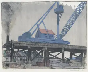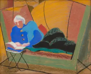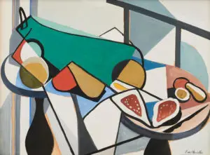 Lot 1 – Ethel Spowers, The Timber Crane, 19 x 23.5 cm, est. $10,000-15,000. Fifty Shades of GreyLot 2 – Herbert Badham, The Bus Stop, 1958, 54.5 x 44 cm, est. $40,000-60,000. Don’t Quit!Lot 3 – Roy de Maistre, Still Life with Marrow, c1934, 28 x 38 cm, est. $50,000-70,000. Modernist Marrow?Lot 4 – Roy de Maistre, Figure on Sofa, c1932, 48 x 59 cm, est. $20,000-30,000. Yves Klein Blue