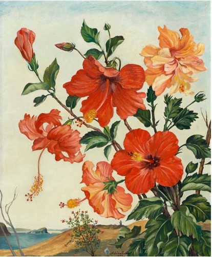 Lot 88 – Adrian Feint, (Hibiscus), 1957, est. $4,000-6,000. Lion Island and lion of a painting