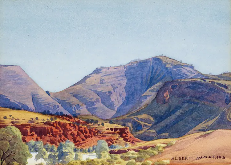 Lot 2, Albert Namatjira, Mount Hermannsburg and Finke River, watercolour, 26 x 36.5 cm. Est. $30,000-40,000. Mountain Magic