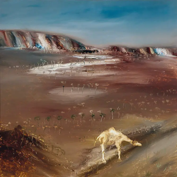 Lot 30, Sidney Nolan, Landscape with Camel (Burke and Wills), 1966, oil, 124.5 x 124.5 cm, est. $180,000-250,000. Not the Time to Get the Hump