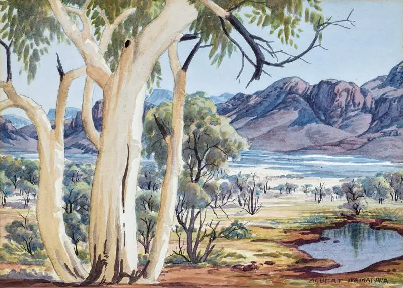Lot 1 – Albert Namatjira, Near Mount Gillen, Central Australia, 1957, watercolour, 25 x 35.5 cm., est. $35,000-$45,000. Includes waterhole and old Holden photo-op