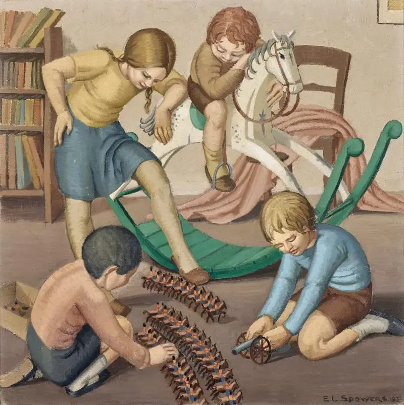 Lot 24 – Ethel Spowers, The Battle, 1933, oil, 41.5 x 41.5 cm, est. $80,000-$120,000. This Painting Rocks