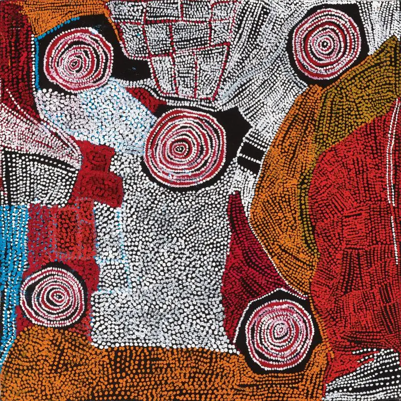 Lot 61 – Bill Whiskey Tjapaltjarri, Rockholes near the Olgas, synthetic polymer paint, 122.5 x 122.5 cm, est. $20,000-$30,000. There’s Whiskey in the Tjapaltjarri