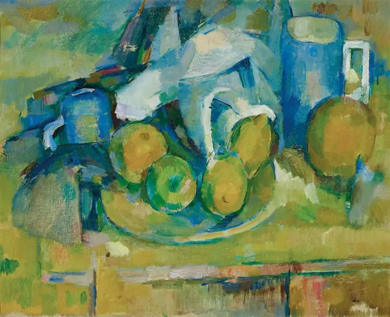 Lot 80 – John Passmore, Still LIfe with Fruit and Jug, oil, 39.5 x 49.5 cm, est. $8,000-$12,000. Cezanne passes the Baton