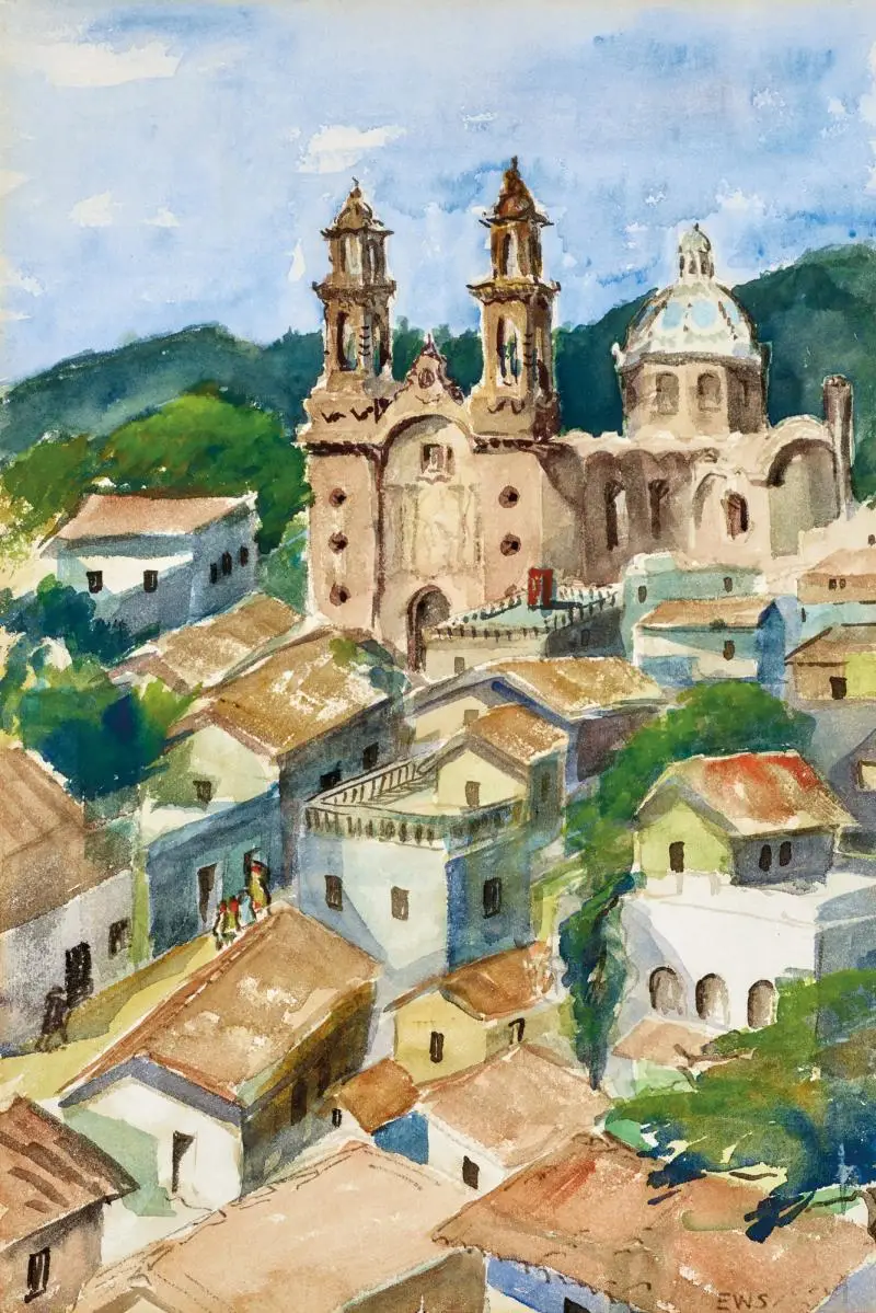 Lot 88 – Eveline Syme, Church of Santa Prisca, Taxco, Mexico, c1948, watercolour, 57 x 38.5 cm, est. $6,000-$8,000. Que Viva Mexico!