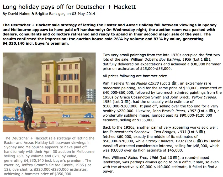 The Deutscher + Hackett sale strategy of letting the Easter and Anzac Holiday fall between viewings in Sydney and Melbourne appears to have paid off handsomely: On Wednesday night, the auction room was packed with dealers, consultants and collectors refreshed and ready to spend in their second major sale of the year. The results confirmed the impression: the auction house sold 76% by volume and 87% by value, generating $4,330,140 incl. buyer’s premium.