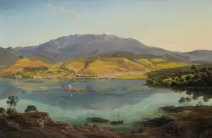 A much later painting by Von Guerard, also with a snow capped mountain in the background, this time Mount Kosciusko from 1883, Creek at the Foot of Mt Kosciuszko (lot 54) sold for $110,000, on estimates of $100,000-$160,000.