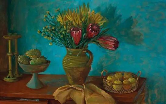 Lot 50 – Margaret Olley, Protea and Fruit, 1976. Oil, 75 x 125 cm, est. $60,000-$80,000. A Jolly Olley