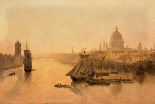 Lot 65 – John Glover, Evening on the Thames, 1808. Watercolour, 73 x 110 cm, est. $25,000-$35,000. Glover’s London