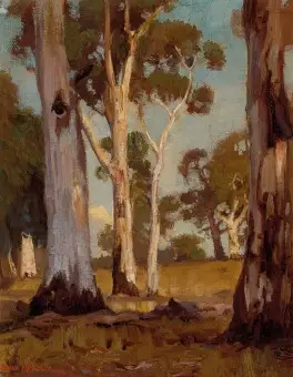 Lot 73 – Hans Heysen, Gums, 1906. Oil on canvas on board, 33 x 26 cm, est. $15,000-$20,000. Hi Ho Heysen
